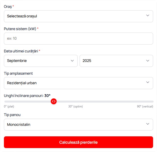 Introdu capacitatea, locația și tipul de montare pentru a obține o estimare personalizată a pierderilor anuale și a perioadei de amortizare pentru curățare profesională.